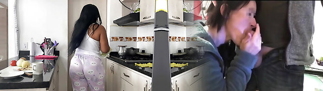 MILF stepmom enjoys making breakfast and fucking her massive cock stepson.